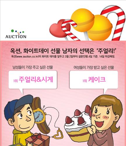 한편, 옥션은 화이트데이 선물로 인기인 패션잡화와 향수, 화장품 등을 할인 판매하며, 사탕과 꽃바구니 배달 상품도 준비했다.