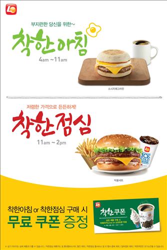 (서울=연합뉴스) 최이락 기자 = 롯데리아는 3월 한 달간 착한아침과 착한점심을 구매하는 고객에게 아메리카노나 소프트콘을 무료로 증정하는 '착한 쿠폰 증정 이벤트'를 한다고 5일 밝혔다.