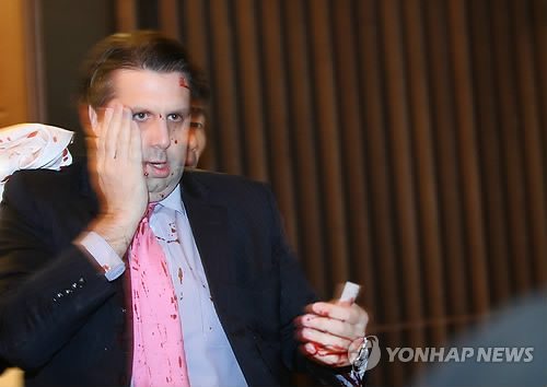 | △ 민화협 행사서 괴한 공격당한 리퍼트 주한 미 대사 (서울=연합뉴스) 김주성 기자 = 마크 리퍼트 주한 미대사가 5일 오전 서울 세종문화회관에서 열린 민족화해협력범국민협의회 주최 초청 강연에 참석했다가 괴한의 공격을 받고 피를 흘리며 행사장을 빠져나가고 있다. |
