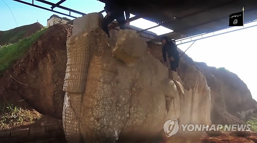 | △ 파괴되는 '날개 달린 황소' (AP=연합뉴스) 수니파 무장조직 '이슬람국가'(IS)가 지난달 26일(현지시간) 소셜 미디어에 올린 동영상에서 캡처한 사진으로, IS 전사들이 이라크 북부 모술 소재 니네바 박물관 야외에서 BC 9세기 아시리아 시대의 '날개 달린 황소' 모양의 석상을 파괴하고 있다. |