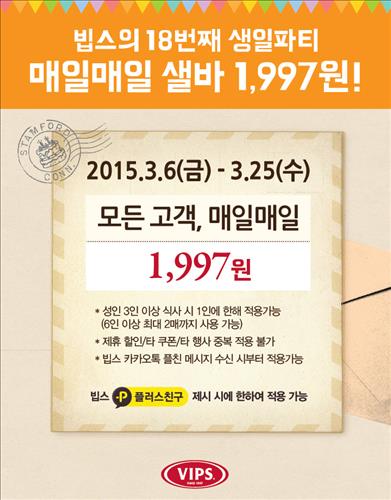 (서울=연합뉴스) 김아람 기자 = 빕스는 론칭 18주년을 기념해 오는 25일까지 일행고객 3명중 1명에게는 샐러드바를 1천997원에 제공한다고 6일 밝혔다.