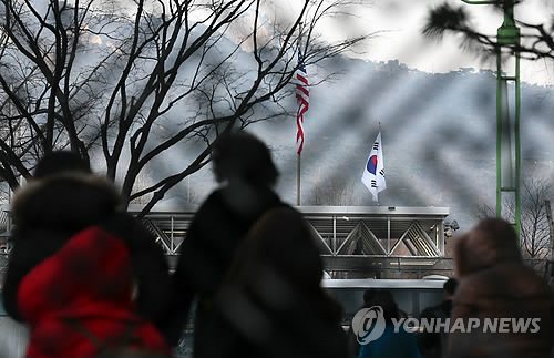 | △ 리퍼트 미대사 테러..한미관계 위기 오나 (서울=연합뉴스) 신준희 기자 = 마크 리퍼트 주한 미대사에 대한 테러 사건이 발생한 지난 5일 오전 서울 종로구 주한미국대사관에 걸린 성조기와 역사박물관 앞 태극기가 함께 보이고 있다. |
