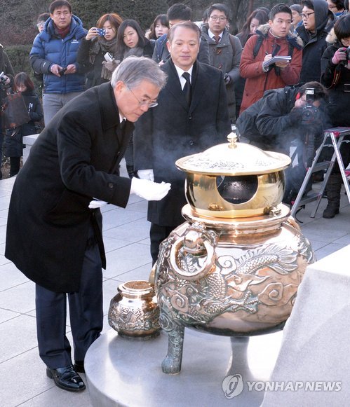 | △ 고(故) 박정희 전 대통령 묘역 참배하는 문재인 (서울=연합뉴스) 이상학 기자 = 새정치민주연합 문재인 대표가 9일 오전 동작구 국립서울현충원 고(故) 박정희 전 대통령 묘역을 참배하고 있다. 2015.2.9 leesh@yna.co.kr |