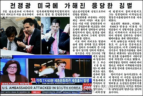 (서울=연합뉴스) 민경락 기자 = 북한 노동당 기관지 노동신문을 비롯한 북한의모든 매체들이 6일 마크 리퍼트 주한 미국대사 흉기 피습 사건을 사진과 함께 일제히 보도했다.