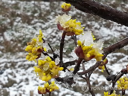 | △ 겨울 끝자락서 봄 소식 알리는 산수유꽃 (구례=연합뉴스) 장아름 기자 = 3월을 맞아 지리산에도 봄이 성큼 다가왔다. 사진은 지난 3일 눈이 내린 전남 구례군 지리산 일대에 산수유꽃이 꽃망울을 틔우고 있는 모습. 2015.3.4 <<국립공원관리공단 지리산국립공원 남부사무소>> areum@yna.co.kr |