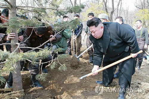 | △ '삽질은 이렇게'…나무심기 지도하는 북한 김정은 (서울=연합뉴스) 북한 김정은 국방위원회 제1위원장이 식수절(3월 2일)을 맞아 2일 공군부대를 방문해 직접 나무심기 '모범'을 보였다고 노동당 기관지 노동신문이 3일 밝혔다. 김 제1위원장은 부대 군인들과 직접 삽을 들고 구덩이 파기, 흙다지기 등 나무심기 '모범'을 보이며 산림조성 사업에서 군대가 앞장설 것을 주문했다. 김 제1위원장의 이날 시찰은 황병서 군 총정치국장, 오일정·한광상 당 부장, 리병철 당 제1부부장, 손철주 공군 정치위원이 수행했다. 2015.3.3 nkphoto@yna.co.kr |