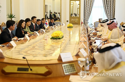 | △ 한국-카타르 정상회담 (도하=연합뉴스) 도광환 기자 = 박근혜 대통령과 타밈 빈 하마드 알타니 카타르 국왕이 8일 오전(현지시간) 카타르 도하 에미리 디완 궁에서 정상회담을 하고 있다. |
