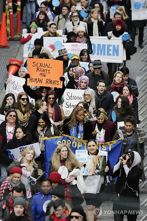 이들은 맨해튼 유엔본부 앞에서 중심부인 타임스퀘어까지 행진하면서 여전히 남성에 비해 저임금을 받고, 각종 정책결정 과정에서 배제되고 있는 여성의 권익 신장을 위해 목소리를 높였다.