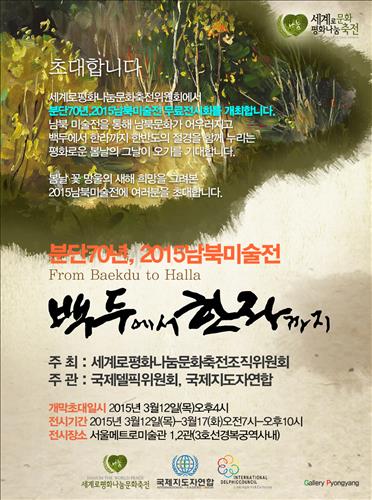 세계로평화나눔문화축전조직위원회(이하 나눔축전조직위)는 오는 12∼17일 서울 지하철 3호선 경복궁역의 서울메트로미술관에서 '분단 70년 남북미술전-백두에서 한라까지'를 개최한다.
