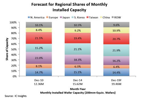 IC인사이츠는 아시아 4국의 웨이퍼 용량 점유율 합계가 70%에 육박한다면서 그중에서도 한국과 중국, 대만은 향후 5년간 점유율을 늘려나갈 것으로 전망했다.