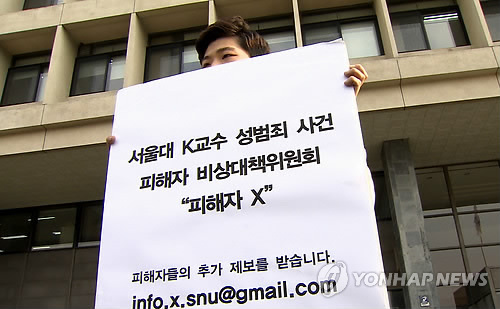 | △ 성추행 의혹 K교수 사태, 서울대 학생들 기자회견 (서울=연합뉴스) 서울대 학생들이 27일 관악캠퍼스 대학본부에서 기자회견을 열고 자신이 가르치는 학생 등을 상습적으로 성추행한 의혹을 받는 서울대 수리과학부 K교수에 대한 학교 측의 철저한 진상조사를 요구하고 있다. K교수는 전날 사표를 제출했고 학교 측은 면직 처리를 하기로 했다. 2014.11.27 << 뉴스Y 화면 캡쳐 >> photo@yna.co.kr |