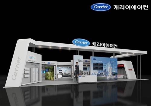 캐리어에어컨은 디자인 차별화, 신기술, 에너지절약 및 친환경 제품을 부스의 테마로 구성하고 에어컨, 냉장, 빌딩 솔루션 등의 구역으로 나눠 관람객을 맞이한다.