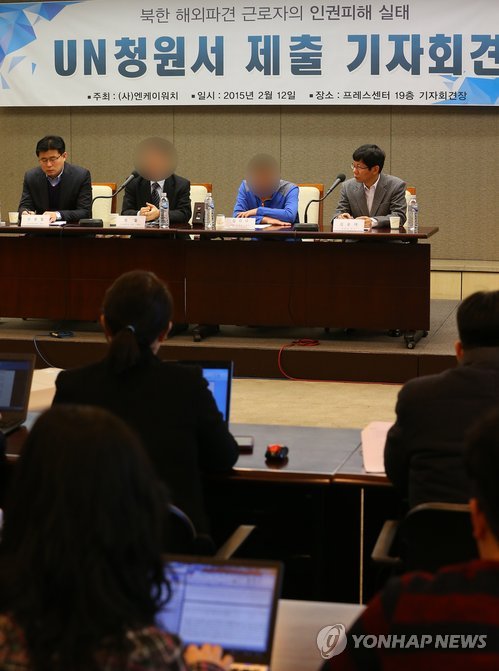 | △ 북한 해외파견 근로자 인권피해 실태 UN 청원서 제출 회견 (서울=연합뉴스) 황광모 기자 = 12일 오전 서울 태평로 프레스센터에서 북한 인권단체 NK워치 주최로 열린 북한 해외파견 근로자 인권피해 실태 UN 청원서 제출 기자회견에서 북한의 외화벌이를 위해 쿠웨이트와 러시아에 파견됐던 탈북자들이 증언하고 있다. NK워치는 지난해부터 해외근로자 출신 탈북자를 심층 인터뷰해 만든 총 13건의 청원서를 스위스 제네바에서 '유엔 현대판 노예제도 특별보고관'에게 제출할 계획이다. 2015.2.12 hkmpooh@yna.co.kr |