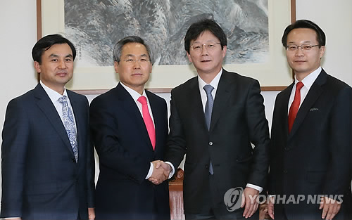 | △ 여야 원내대표 주례회동 (서울=연합뉴스) 진성철 기자 = 새누리당 조해진 원내수석부대표(오른쪽 부터), 유승민 원내대표와 새정치민주연합 우윤근 원내대표, 안규백 원내수석부대표가 10일 국회 운영위원장실에서 열린 주례회동에서 손을 맞잡고 있다. |