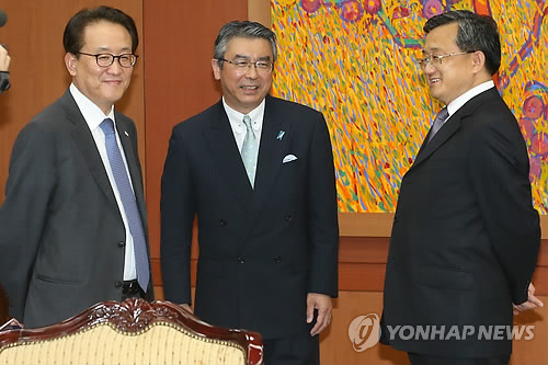 | △ 한중일 3국 고위급 회담을 앞둔 지난해 9월 11일 서울 도렴동 외교부청사에서 각국 수석대표인 이경수 외교부 차관보(왼쪽부터), 스기야마 신스케 일본 외무성 외무심의관, 류전민 중국 외교부 부부장이 대화하고 있다. (연합뉴스 자료사진) |