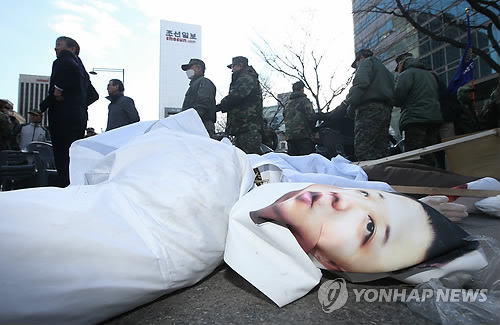 | △ 쓰러진 김정은 허수아비 (서울=연합뉴스) 임헌정 기자 = 9일 오후 서울 중구 동화면세점 앞에서 대한민국고엽제전우회 주최로 열린 '한미동맹 강화 북괴 김정은 타도 종북세력 척결대회'에서 참석자들이 쓰러트린 북한 김정은 국방위원회 제1위원장의 허수아비가 놓여 있다. 2015.3.9 kane@yna.co.kr |