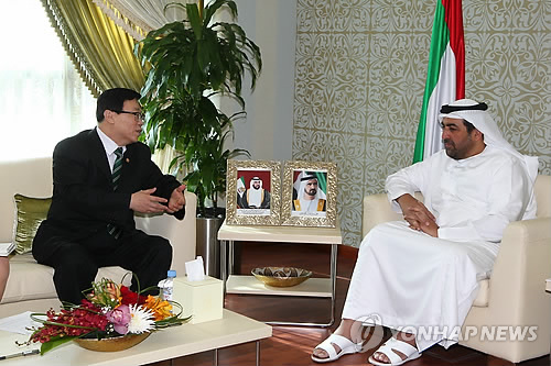 | △ 이동필 농림축산식품부장관이 지난 4일(현지시간) 아랍에미리트를 방문해 라쉬드 아흐메드 빈 파하드 환경수자원부 장관과 농업 및 할랄식품과 관련한 양국 협력 방안에 대해 논의하고 있다. (농림축산식품부 제공) |