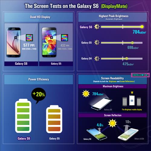 디스플레이메이트의 평가 보고서에 따르면 갤럭시S6는 5.1인치 화면에 QHD(2560X1440)의 해상도를 갖춰 전작인 갤럭시S5의 FHD(1920X1080)에 비해 픽셀수가 2배 가까이 늘었다.