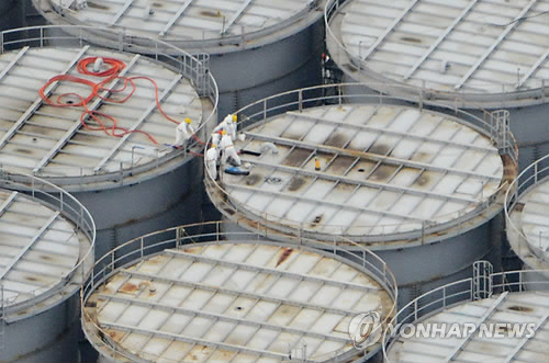 | △ 2013년 8월 20일 일본 후쿠시마 제1원전 부지 내 오염수 탱크 위에서 작업자들이 움직이고 있다.(교도=연합뉴스DB) |
