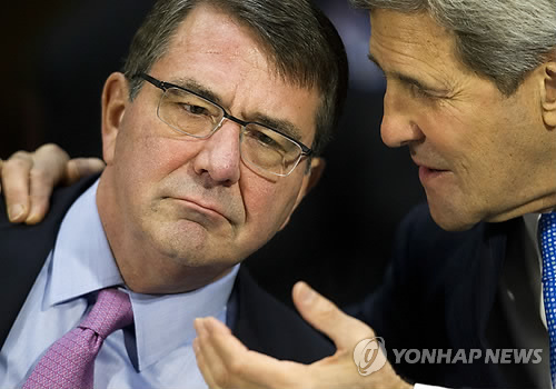 | △ 애슈턴 카터 미국 국방장관(왼쪽)과 존 케리 국무장관 (AP=연합뉴스 자료사진) |