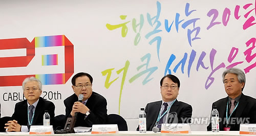 케이블TV 업계 대표들은 12일 케이블TV 출범 20주년을 맞아 동대문 디자인플라자에 마련한 기자간담회에서 통신사들의 결합상품 공세에 방송시장이 붕괴되고 있다고 우려했다.