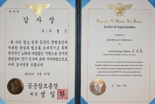 터키 하벨산, EWTS 인수로 한국공군서 감사장 받아