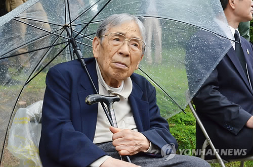 | △ 모토시마 히토시(本島等) 전 나가사키(長崎) 시장이 2014년 7월 6일 나가사키 평화공원에서 열린 중국인 원폭 희생자 추도식에 참석했을 때의 모습. (연합뉴스 자료사진) |