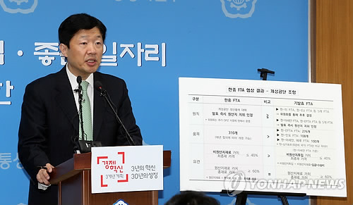 (세종=연합뉴스) 김재홍 차병섭 기자 = 정부가 한·중 자유무역협정(FTA) 보완대책의 하나로 무역이득공유제 도입을 본격 검토키로 한 것으로 13일 알려졌다.