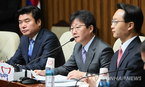 | △ 유승민 "연금개혁안 5월2일 처리 움직일 수없는 일정" (서울=연합뉴스) 진성철 기자 = 새누리당 유승민 원내대표가 13일 국회에서 열린 주요당직자회의에서 공무원연금 개혁과 관련, "3월 28일 (대타협기구) 활동시한까지 대타협안을 만들고, 5월 2일까지 본회의서 이를 처리하는 것을 여야 지도부가 계속 합의해왔기 때문에 이는 움직일 수 없는 일정"이라고 말하고 있다. |