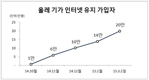(서울=연합뉴스) 전성훈 기자 = KT[030200]는 올레 기가 인터넷 가입자 수가 서비스 출시 4개월 만에 20만명을 돌파했다고 13일 밝혔다.