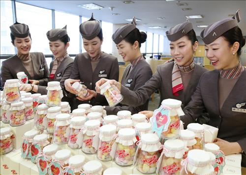 (서울=연합뉴스) 김윤구 기자 = 박삼구 금호아시아나 그룹 회장이 화이트데이인 14일 여직원들에게 사탕을 선물했다.