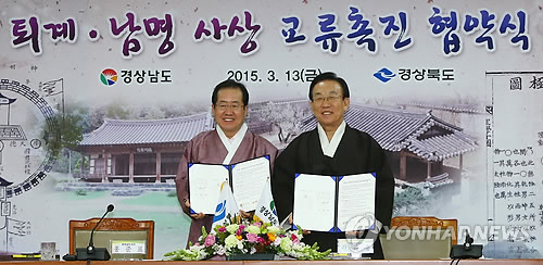 | △ 남명·퇴계사상 교류협약 (대구=연합뉴스) 김준범 기자 = 한복을 입은 홍준표 경남도지사와 김관용 경북도지사가 13일 오후 대구 북구 경상북도청 회의실에서 퇴계·남명사상 교류 촉진을 위한 상호 협약을 체결하고 있다. 양 지자체는 또 상생발전을 위해 유교문화 콘텐츠를 활용한 관광상품을 개발하고 문화사업을 확대하는 데 협력할 방침이다. 2015.3.13 psykims@yna.co.kr |