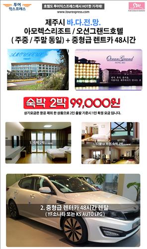 (서울=연합뉴스) 전준상 기자 = SM C&C투어익스프레스는 13일 제주 아모렉스리조트 또는 함덕 오션그랜드호텔 바다전망 객실 숙박 2일과 중형급 렌터카 48시간 대여를 포함한 상품을 9만9천원에 선착순 판매한다.