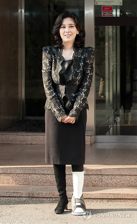 | △ 이부진, 깁스 한채 주총 참석 (서울=연합뉴스) 이부진 호텔신라 사장이 왼쪽 다리에 깁스한 채 13일 주주총회가 열린 서울 장충동 삼성사옥에 들어가고 있다. (호텔신라 제공) |