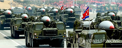 | △ 북한은 연례 한미합동군사연습인 키 리졸브 연습이 시작된 지난 2일 새벽 스커드c 계열 미사일로 추정되는 단거리 탄도미사일 2발을 동해 상으로 발사했다. 사진은 지난 2013년 북한군의 퍼레이드에 등장한 스커드 미사일. <<연합뉴스DB>> |