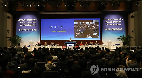 | △ 삼성전자 정기주주총회 (서울=연합뉴스) 박지호 기자 = 13일 오전 서울 삼성전자 서초사옥에서 열린 '삼성전자 정기 주주총회'에서 권오현 의장(삼성전자 부회장)이 인사말을 하고 있다. |