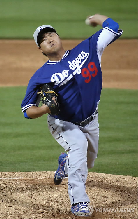 | △ 류현진 듬직하게 돌아왔다 (피오리아<미국 애리조나>=연합뉴스) 황광모 기자 = 13일(한국시간) 미국 애리조나 피오리아 스포츠 콤플렉스에서 열린 미국 메이저리그 시범경기 LA 다저스와 샌디에이고 파드리스의 경기에서 LA 선발 류현진이 2회말 역투하고 있다. 2015.3.13 hkmpooh@yna.co.kr |