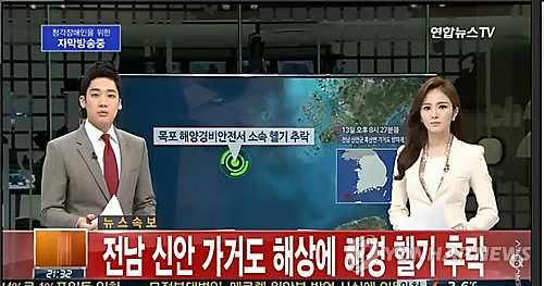 | △ 13일 오후 8시 27분께 전남 신안군 흑산면 가거도 방파제 남쪽 1마일 해상에서 목포 해양경비안전서 소속 B-511 헬기가 추락했다.(연합뉴스TV 캡처) |