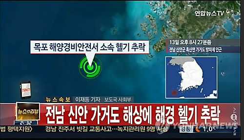 (신안=연합뉴스) 장아름 기자 = 악천후 속에 섬 지역 응급환자를 이송하기 위해 착륙을 시도하던 해경 헬기가 바다에 추락했다.