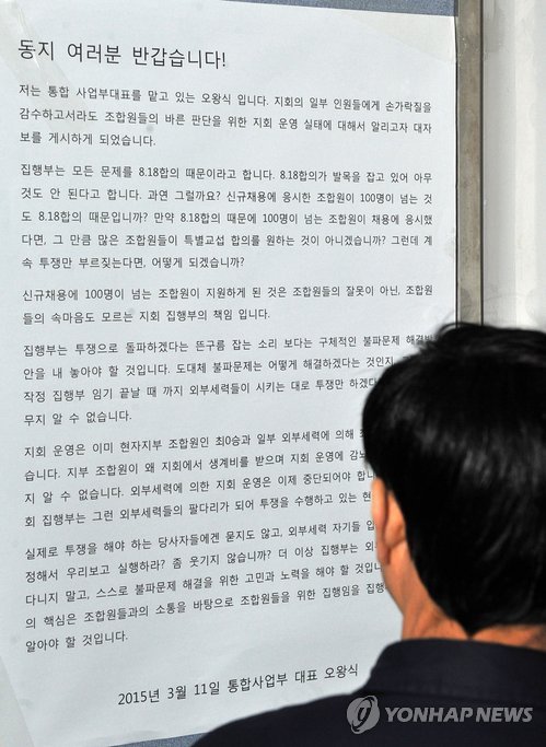 이들은 대자보에 '8.18 합의' 인정, 현 투쟁방식 비판, 현 집행부의 불통 비판 등의 내용을 담았다.