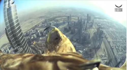 펼친 날개 폭이 2m인 흰죽지수리는 300g의 초소형 카메라 소니액션캠미니를 등에 메고 부르즈 칼리파 꼭대기의 안테나 위에서 지상을 향해 약 1분 40초간 날아 조련사의 팔에 안착했다.