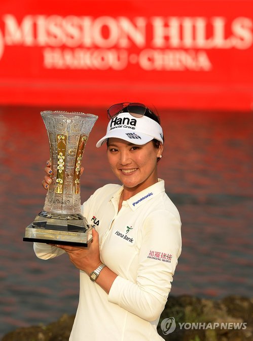 | △ 유소연, 월드 레이디스 챔피언십 최종우승 (서울=연합뉴스) 유소연이 15일 중국 하이난성 하이커우 미션힐스골프장 블랙스톤코스에서 열린 LET 월드 레이디스 챔피언십에서 최종합계 13언더파 279타로 우승을 차지한 후 우승 트로피를 들고 기념촬영을 하고 있다. 2015.3.15 << 미션힐스 제공 >> photo@yna.co.kr |