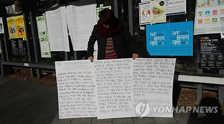| △ 중앙대 학사구조 선진화 계획 반대 1인 시위 (서울=연합뉴스) 고은지 기자 = 중앙대가 2016학년도부터 학과제를 전면 폐지하기로 한 것에 반대해 1인 시위 중인 중앙대 철학과 2학년 조영일(21) 씨. 조씨는 "대학본부가 발표한 '학사구조 선진화 계획'은 학문의 융복합을 꾀한다는 취지이나 그 속을 보면 각 학문이 살아남기 위한 경쟁을 하도록 한 것"이라고 비판했다. 2015.3.4 << 조영일 씨 제공 >> eun@yna.co.kr |