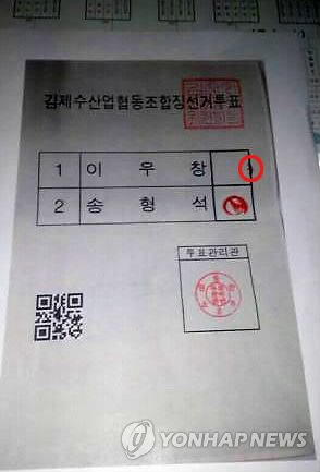 | △ 김제수협 당락 결정한 '무효표 논란' (김제=연합뉴스) 제1회 전국동시조합장 선거에서 동점 득표를 기록한 전북 김제수협이 '무효표 논란'에 휩싸였다. 지난 11일 치러진 선거에서 김제수협은 송형석, 이우창 후보가 출마해 맞붙었다. 두 후보는 유효 투표 914표 중 똑같이 457표를 얻었지만, '동점득표일 경우 연장자를 당선인으로 한다'는 수협 규정에 따라 이우정 후보가 당선됐다. 그러나 송 후보는 '무효표'로 판정된 투표 용지에 문제가 있다며 이의신청을 한 상태다. 빨간색 동그라미 안이 무효표의 판단 근거가 된 인주 흔적. 2015.3.17 <<송영석 후보 제공>> chinakim@yna.co.kr |