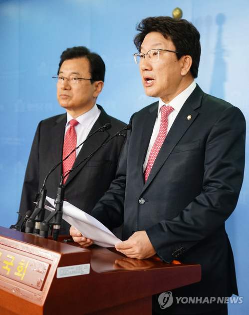 | △ 해외자원개발 국조특위 권성동 간사 기자회견 (서울=연합뉴스) 진성철 기자 = 정부 및 공공기관 등의 해외자원개발 진상규명을 위한 국정조사특별위원회 소속 새누리당 권성동 여당 간사(오른쪽)와 이현재 의원이 17일 국회 정론관에서 이라크 쿠르드 원전 개발과 관련해 기자회견하고 있다. |