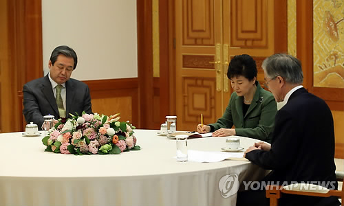 | △ 발언하는 문재인, 메모하는 박 대통령과 김무성 (서울=연합뉴스) 도광환 기자 = 17일 오후 청와대에서 열린 여야대표 회동에서 새정치민주연합 문재인 대표가 발언하자 박근혜 대통령과 새누리당 김무성 대표가 메모하고 있다. |