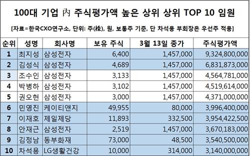 18일 기업분석 전문업체 한국CXO연구소(소장 오일선)가 국내 100대 기업 사업보고서를 토대로 전문경영인 임원들의 주식평가액을 분석한 자료에 따르면, 최 부회장은 삼성전자[005930] 보통주 6천400주를 보유한 것으로 집계됐다.