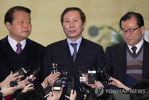 | △ 질문에 답하는 개성공단 관계자들 (파주=연합뉴스) 윤동진 기자 = 북한이 개성공단 북측 근로자의 임금인상을 일방적으로 통보하면서 남북간 긴장감이 조성되는 가운데 18일 오전 경기 파주시 경의선 남북출입사무소에서 정기섭 개성공단협회장(가운데)을 포함한 개성공단 입주기업 대표단이 취재진의 질문에 답하고 있다. 이날 대표들은 개성공단을 찾아 북측의 일방적인 임금인상 요구에 항의하고 문제 해결을 촉구하는 문서를 북측에 전달할 예정이다. 2015.3.18 mon@yna.co.kr |