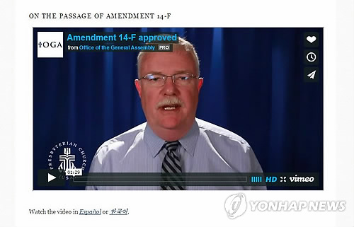(샌프란시스코=연합뉴스) 임화섭 특파원 = 미국 최대 장로교단인 '미합중국 장로교회'(The Presbyterian Church USA·약칭 PCUSA)가 동성 결혼을 인정키로 했다.