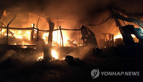 | △ 불타오르는 공장 (청주=연합뉴스) 김형우 기자 = 18일 오후 7시 39분께 청주시 옥산면 장동리의 종이박스 제조공장에서 원인을 알 수 없는 불이 났다. 2015.3.18 vodcast@yna.co.kr |